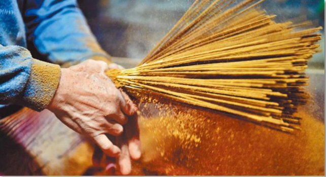 神香屬手工制作行業(yè),可分搓香、淋香和榨香三種制法。昔日澳門的制香廠多集中在沙梨頭及田畔街一帶的空曠土地上,以方便曬香。澳門神香制成品種類多樣,有長短、粗細、形狀、顏色之分,價格也會因應香料質量優(yōu)劣高低而有所不同。